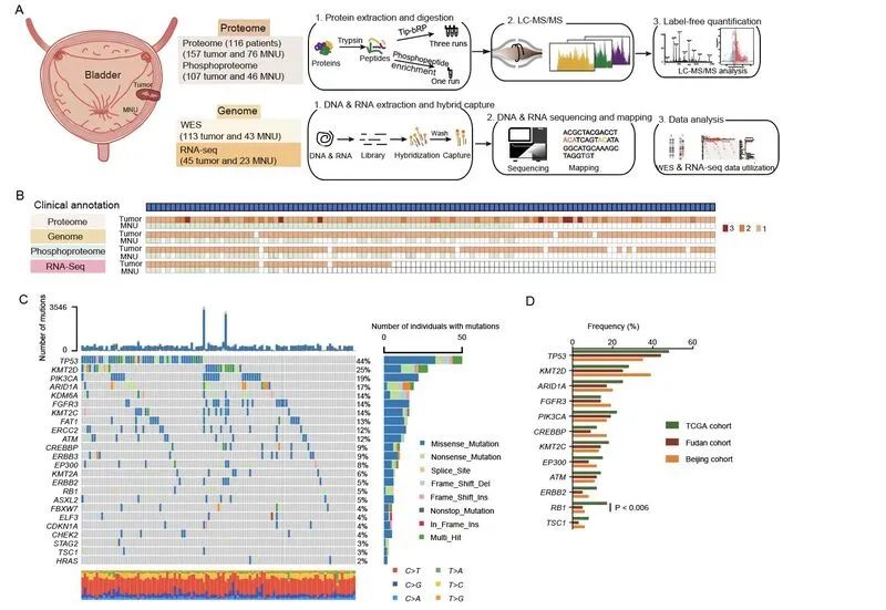 多团队开展的研究,通过大队列样本描绘了中国人群的膀胱尿路上皮癌多组学图谱。基因组鉴定到膀胱癌中常见的突变,如TP53、 KMT2D、 PIK3CA和 FGFR3等。肿瘤和形态学正常的尿路上皮对比的多组学分析发现:肿瘤组织高表达细胞周期和细胞粘附通路,形态学正常的尿路上皮中高表达的通路有上皮细胞分化和跨膜转运。