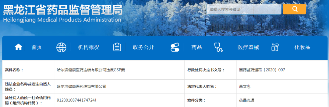 除此之外,黑龙江省药监局今日也发布了一则行政处罚通知。