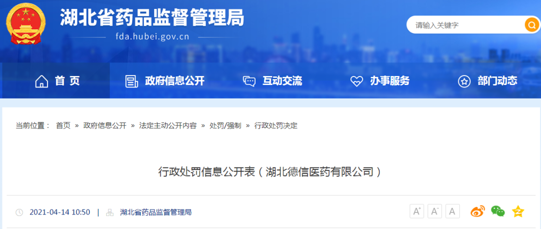 4月14日,湖北省药监局发布了一则行政处罚信息公开表。
