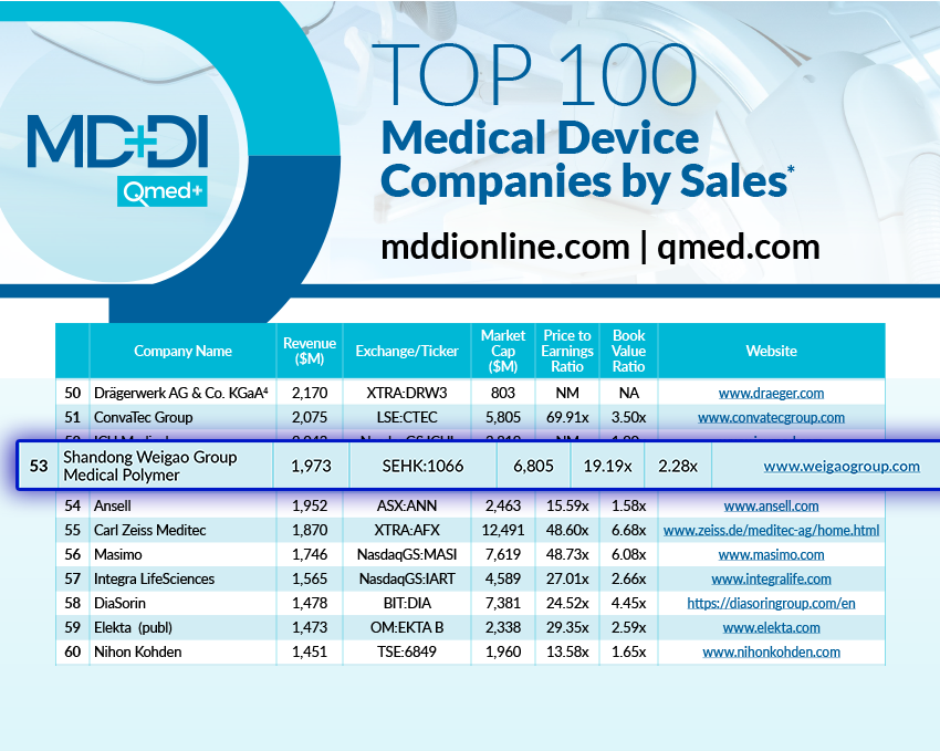 近日,医疗器械行业权威网站MD+DI QMED发布了《2022年全球100强医疗器械企业榜单》,该榜单根据2022财年的营收状况对全球医疗器械公司进行了排名。威高集团下属山东威高集团医用高分子制品股份有限公司(以下简称“威高股份”,股票代码:HK1066)位列全球100强医疗器械企业第53位。
