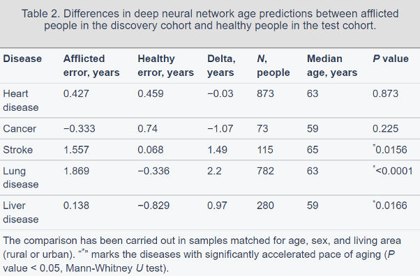 如何证明衰老时钟的预测代表了衰老速度呢?研究人员考察了衰老时钟对衰老相关疾病患者的预测年龄是否比健康人的年龄大。Discovery集的参与者有癌症、心脏病发作、中风、肝病或肺病病史,Test集的所有参与者都没有这些病症。根据衰老时钟的预测,有中风、肝病和肺部疾病史的人与健康人相比年龄明显增大(如下表)。然而,这些疾病对预测年龄的平均影响不超过+1.50岁。与健康对照组相比,有心脏病或癌症病史的人的年龄预测没有显著差异。