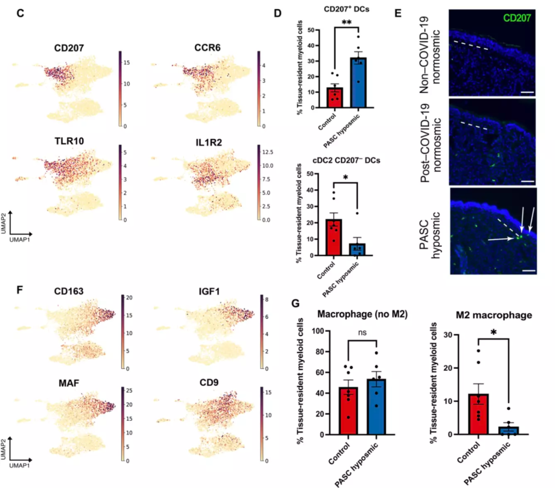长期嗅觉丧失的感染者体内,另一个出现变化的是巨噬细胞群。研究者观察到,以CD163为标志的抗炎M2巨噬细胞显著减少,这也是促炎信号持续存在、嗅觉神经元修复过程被抑制的重要原因之一。