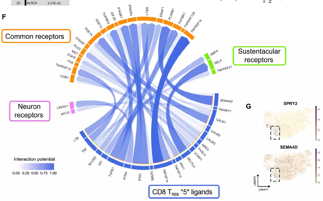 从免疫学角度来看,这种细胞又称为γδ T细胞,能够表达炎症细胞因子干扰素-γ,而干扰素-γ能介导免疫调节反应和适应性免疫。有趣的事情来了,基因表达分析显示,在支持细胞和嗅觉神经元中存在CD8 Tres 5细胞表达的信号配体以及干扰素-γ的受体。