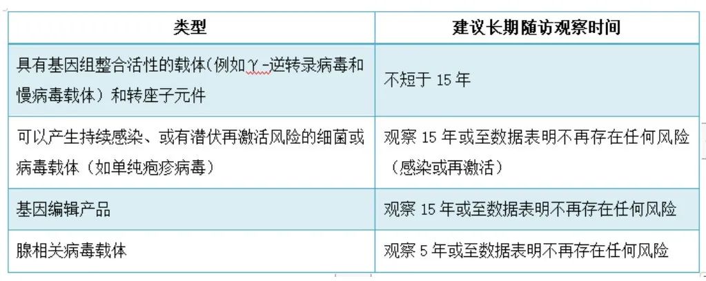 基因治疗作为一种新兴的疗法,其长期安全性仍是未知的,长期随访的持续时间应确保足以观察到受试者因产品特性、暴露情况(生物分布和给药途径)等导致的风险,应不短于迟发性不良反应的预期发生时间。一般而言,针对不同类型的基因治疗产品长期随访观察时间建议如下表: