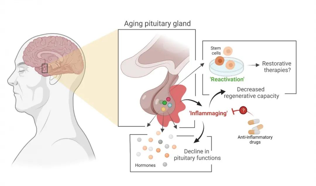 这项研究还提出了另一个有趣的途径:使用消炎药来减缓脑垂体老化或使老化的脑垂体恢复活力。几项研究表明,抗炎药可能对一些衰老的器官有积极影响。但目前还没有对这种与垂体有关的效应进行研究。
