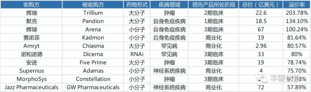 图2 2021年医药TOP 10溢价收购事件(丰硕创投整理,溢价以事件公布前1日收盘价为基准)