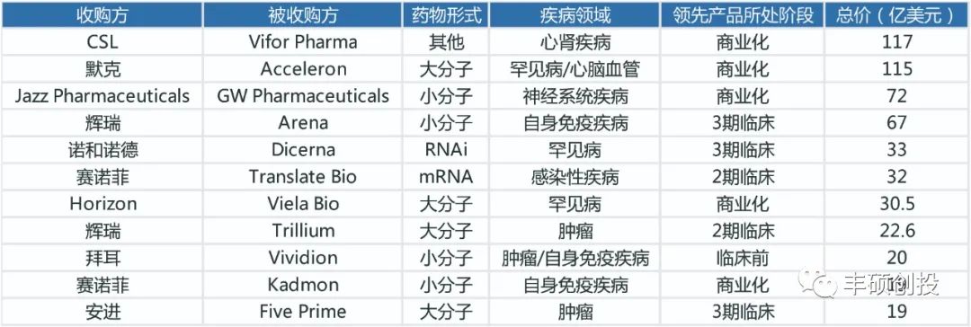 图1 2021年医药TOP 10金额收购事件(丰硕创投整理)