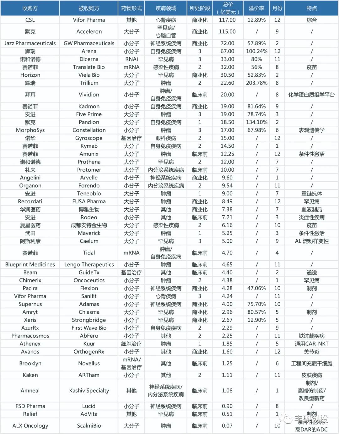 2021年全球医药收购事件总体上出手次数和2020年相差不大,但在金额规模上却大幅低于2020年,2021年医药收购事件的关键词汇为罕见病、RNA药物、条件性激活抗体和递送。