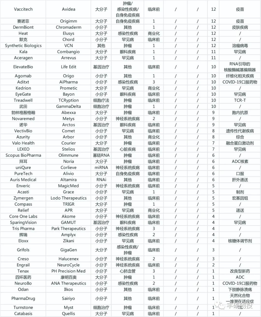 但是2021年与2020年不同的是,商业化阶段公司的比例大幅降低,临床前阶段公司大幅增加,意味着2021年有许多新颖前沿的技术吸引着药企急速布局。如抗体的条件性激活平台(赛诺菲-Amunix和ALX Oncology-ScalmiBio)、递送平台(Beam-GuideTx和Auris Medical-Altamira)和其他等等。