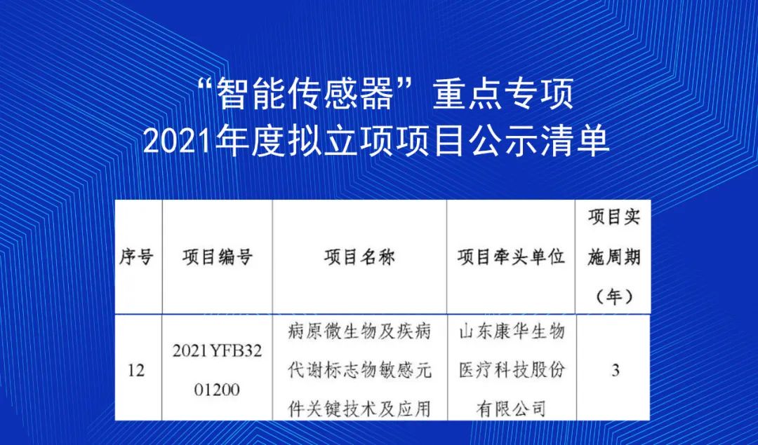 近日,科技部公示了国家重点研发计划“智能传感器”重点专项2021年度立项项目,由山东康华生物医疗科技股份有限公司牵头,山东省科学院生物研究所、中国人民解放军军事科学院军事医学研究院、中国科学院苏州生物医学工程技术研究所等多家单位联合申报的“病原微生物及疾病代谢标志物敏感元件关键技术及应用”项目成功入选。