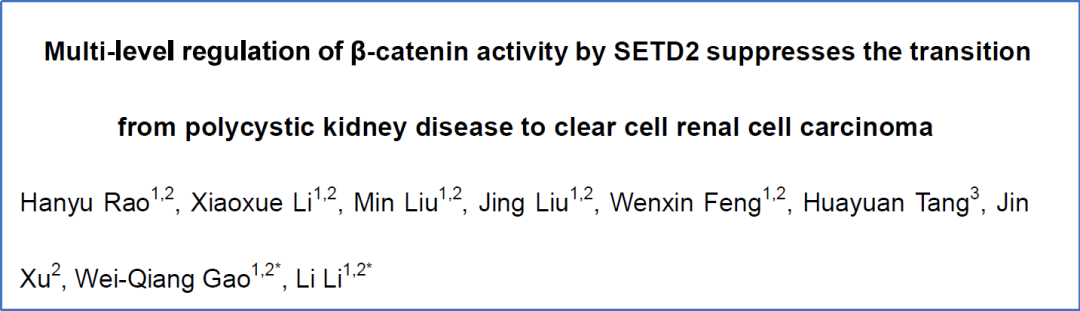 3. Rao H, Li X, Liu M, et al. Multi-level regulation of β-catenin activity by SETD2 suppresses the transition from polycystic kidney disease to clear cell renal cell carcinoma. Cancer Res. 2021 Apr 28: canres. 3960. 2020.