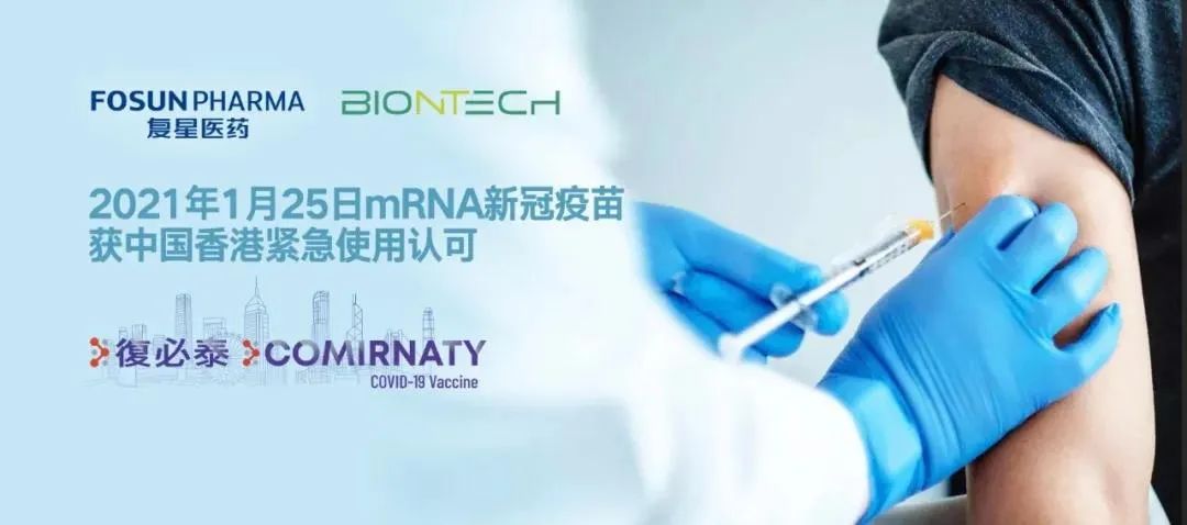 上海复星医药和德国BioNTech共同宣布 mRNA新冠疫苗于中国香港获紧急使用认可。上海复星医药(集团)股份有限公司与BioNTech SE共同宣布,基于BioNTech的mRNA技术的新冠疫苗COMIRNATY(即BNT162b2,中文商品名:復必泰TM)获香港特别行政区食物及卫生局认可在香港作紧急使用。未来供应香港的疫苗将直接由BioNTech在德国的工厂进行生产,用于香港特区政府新冠疫苗接种计划下的供应、分发和施用等。2020年3月16日,BioNTech和复星医药宣布达成战略合作协议,双方将基于BioNTech专有的mRNA技术平台,在大中华地区共同开发、商业化针对新冠病毒的疫苗产品。