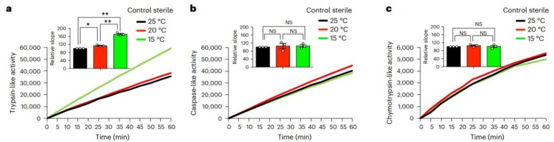 ▲较低的温度(15℃)特异性提高了线虫体内蛋白酶体的类胰蛋白酶活性(图片来源:参考资料[1])