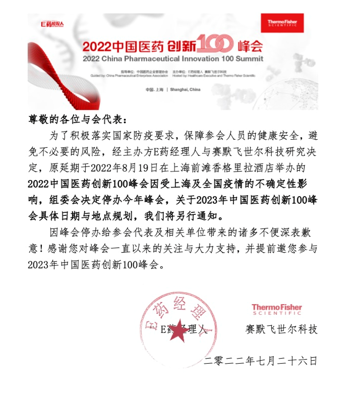原延期于2022年8月19日在上海前滩香格里拉酒店举办的2022中国医药创新100峰会因受上海及全国疫情的不确定性影响,组委会决定停办今年峰会,关于2023年中国医药创新100峰会具体日期与地点规划,我们将另行通知。