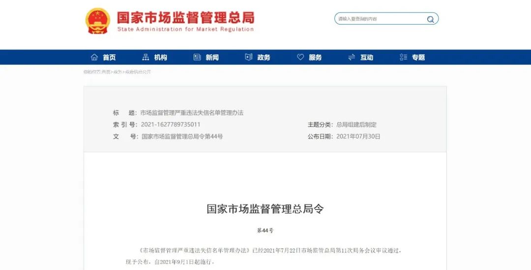 国家市场监督管理总局此前公布的《市场监督管理严重违法失信名单管理办法》(以下简称《办法》)、《市场监督管理行政处罚信息公示规定》《市场监督管理信用修复管理办法》等三份部门规章和规范性文件,自2021年9月1日起正式施行。