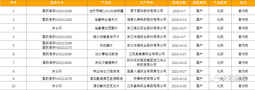 截至2021年5月6日NMPA披露,2021年4月共批准国产首次注册药品84件。按剂型去重后,共69个药品品种,均为仿制药品,其中10款首仿上市药品,包含酒石酸伐兰克尼、托吡酯片等多个年销售额过亿的重磅产品。随着政策的利好,药企在布局创新药研发的同时,首仿药物的研发也是发展方向之一。
