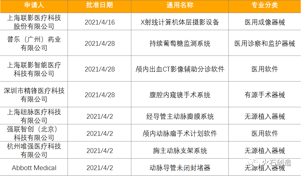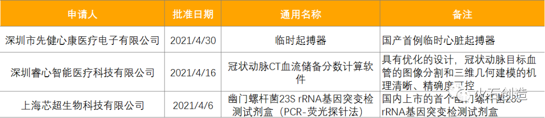 截止2021年5月6日,2021年4月国家局公示了3个三类创新医疗器械获批上市。见表6。