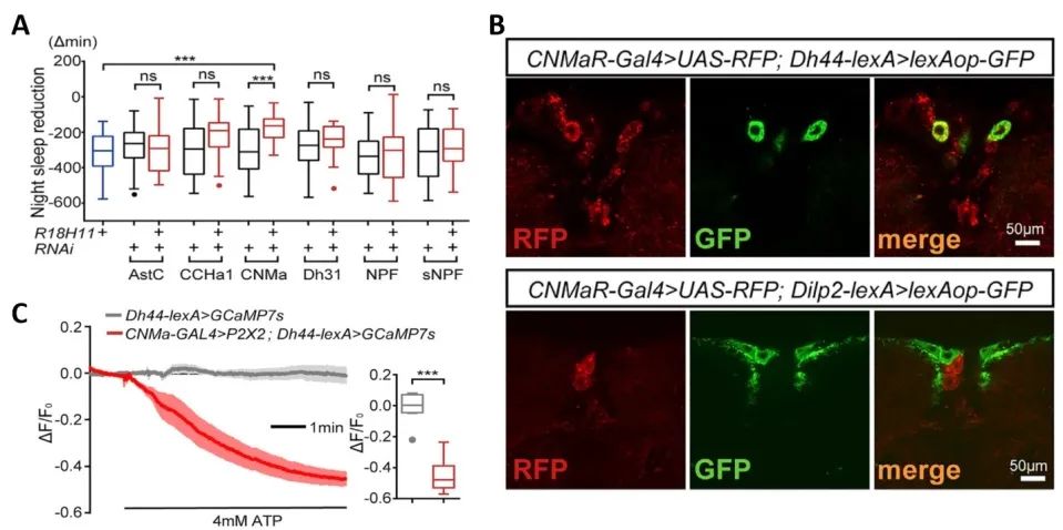 相当于哺乳动物的下丘脑结构,且与DN1ps存在直接突触联系。研究人员通过分析CNMa受体