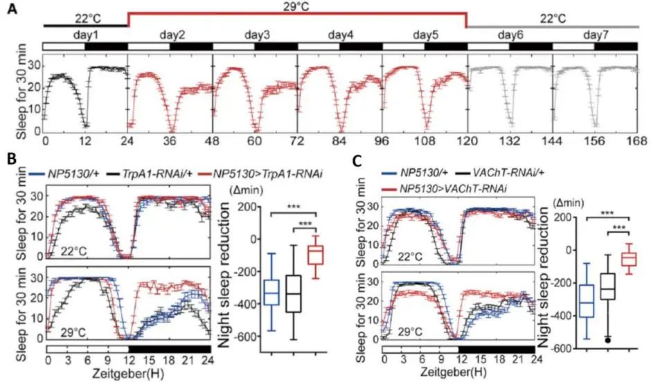 。该研究鉴定出特异性标记感温神经元ACs的工具果蝇NP5130-GAL4,利用这一工具果蝇敲降ACs中TrpA1的表达水平使得高温促进夜晚觉醒的作用减弱,果蝇在高温环境中依然保持较高的睡眠总量