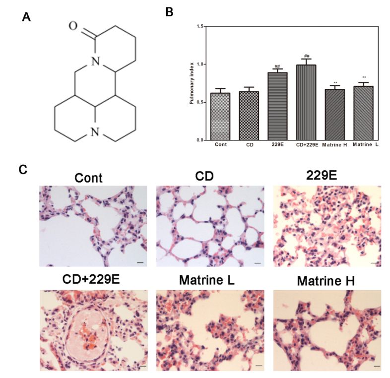 苦参碱氯化钠注射液最初用于慢性活动性肝炎和慢性迁延性肝炎,是一个名副其实的老药,遵循“老药新用”的思路,中国中医科学院中药研究所与湖北康沁药业股份有限公司合作,基于肺指数、肺指数抑制率、肺组织病理损伤等多种病理生理指标,综合评价了苦参碱氯化钠注射液对人冠状病毒肺炎寒湿疫毒袭肺证病证结合模型小鼠的治疗作用。