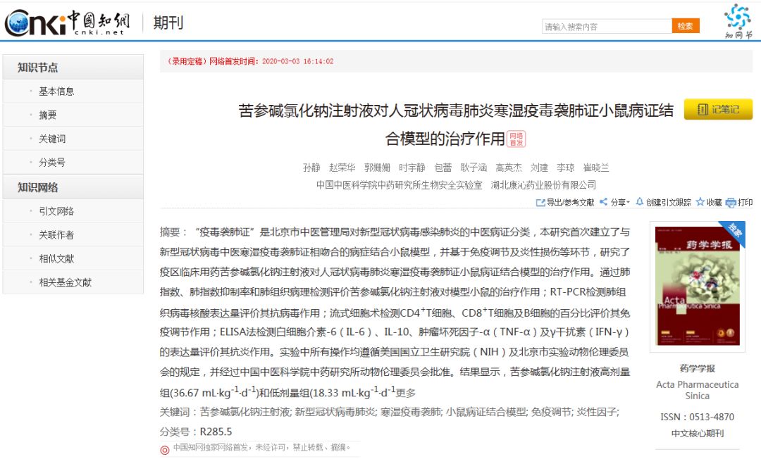 基于以上研究成果,研究人员在药学学报杂志发表论文《苦参碱氯化钠注射液对人冠状病毒肺炎寒湿疫毒袭肺证小鼠病证结合模型的治疗作用》,为苦参碱抗新型冠状病毒肺炎的临床应用提供了有力的实验室数据支持。