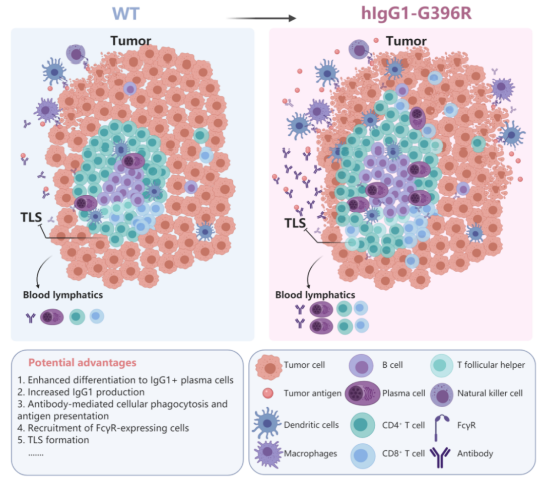 由于B淋巴细胞主导的体液免疫、T淋巴细胞主导的细胞免疫以及固有免疫细胞主导的先天免疫在肿瘤微环境中一直是相互影响并密切相关的。为了进一步探究上述结果背后的免疫学机制,课题组使用流式细胞染色和免疫组化染色等多种研究手段,发现在hIgG1-G396R纯合基因型肿瘤患者和mIgG2c-G400R-KI小鼠的肿瘤微环境中,cDC1 DC细胞和CD8+ T细胞的浸润水平和活化水平显著增加,更重要的是肿瘤微环境中趋化因子转录水平和三级淋巴样结构的面积、数量和活性也显著增加。作为对论文核心结论的进一步独立确证,通过与北京大学张泽民教授和张雷博士(现深圳湾实验室特聘研究员)合作进行结直肠癌肿瘤组织的单细胞转录分析发现hIgG1-G396R纯合基因型患者的肿瘤微环境中,IgG+浆细胞、CXCR5+滤泡辅助T细胞、CXCR6+ 活化型辅助T细胞、CD6+肿瘤驻留性CD8+ T细胞和CD160+上皮内CD8+ T细胞都得到了上调,而Treg细胞和LAYN+ 耗竭性CD8+ T细胞呈现下调特征。前述结果证明hIgG1-G396R不仅影响了肿瘤组织中浆细胞的分化和肿瘤特异性抗体的产生,还通过改变肿瘤患者的免疫微环境,从而增强癌组织微环境中的整体性抗肿瘤免疫力。为了进一步探究增强的抗体应答如何影响肿瘤微环境,课题组发现G400R小鼠具有更高浓度的抗原特异性抗体而增强吞噬细胞的吞噬能力,且在G400R小鼠血清中纯化得到的IgG包被的肿瘤细胞可以增强DC细胞向T细胞呈递抗原的能力。最后,该研究使用来源于mIgG2c-G400R小鼠的肿瘤相关的B细胞或者抗体进行过继转移在小鼠肿瘤模型中显示出治疗功效,解释了潜在的临床意义。