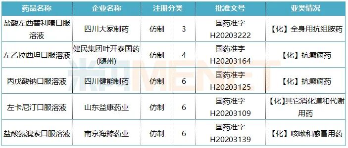 四川大冢制药的盐酸左西替利嗪口服溶液、健民集团叶开泰国药(随州)的左乙拉西坦口服溶液按新分类获批视同通过一致性评价。丙戊酸钠口服溶液、左卡尼汀口服溶液、盐酸氨溴索口服溶液3个产品目前暂无企业过评。