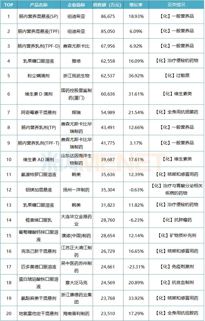 内服溶液剂品牌TOP20中,涉及一般营养品有5个,咳嗽和感冒用药有3个,维生素、治疗便秘的药物各有2个。