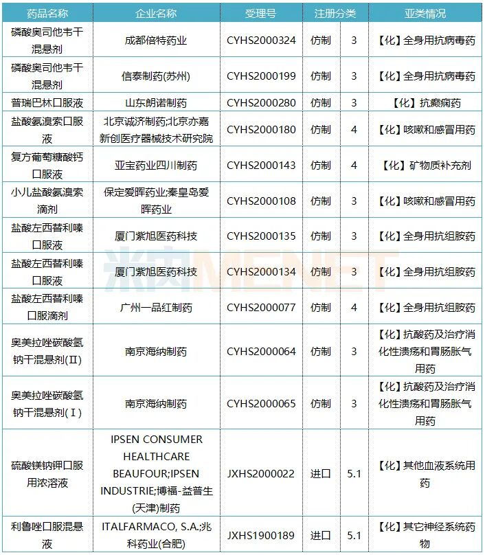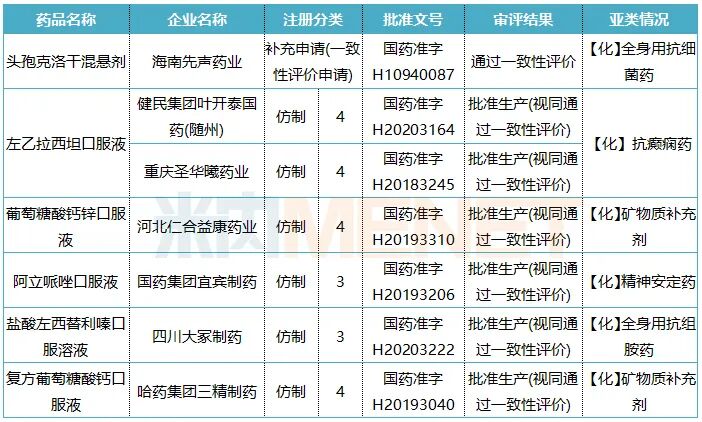在一致性评价补充申请方面,海南普利制药的地氯雷他定干混悬剂、国药集团汕头金石制药的头孢丙烯干混悬剂以及海南三叶美好制药的头孢泊肟酯干混悬剂正在审评审批中。