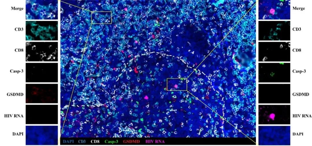 该工作首次在HIV感染者体内证实之前关于CD4+ T减少机制的猜想:HIV病毒活跃复制的细胞倾向于发生凋亡;未被病毒感染的旁观者细胞容易发生焦亡
