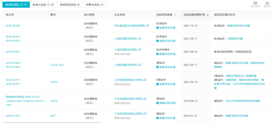 10 月 13 日,恒瑞医药的 ADC 新药 SHR-A2009 获批临床。迄今,恒瑞已经有 7 款 ADC 项目进入临床阶段(包括一款 T-DM1 类似药),为国内 ADC 项目最多的企业。