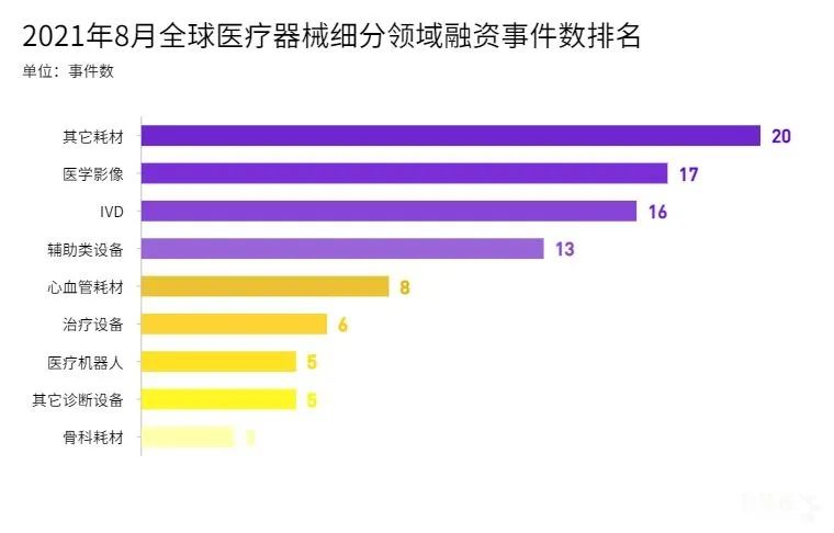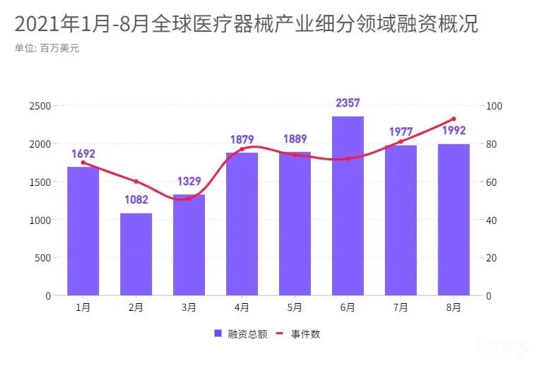 根据动脉橙数据库不完全统计,2021年8月,全球医疗器械领域共发生93起融资事件,披露融资总额超过19.92亿美元。