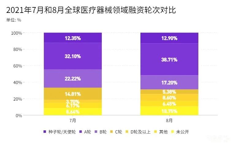 8月全球医疗器械融资事件中,公开轮次的有83起,未公开轮次的融资事件10起。融资轮次主要集中在A轮,在总融资事件数量占比39%。