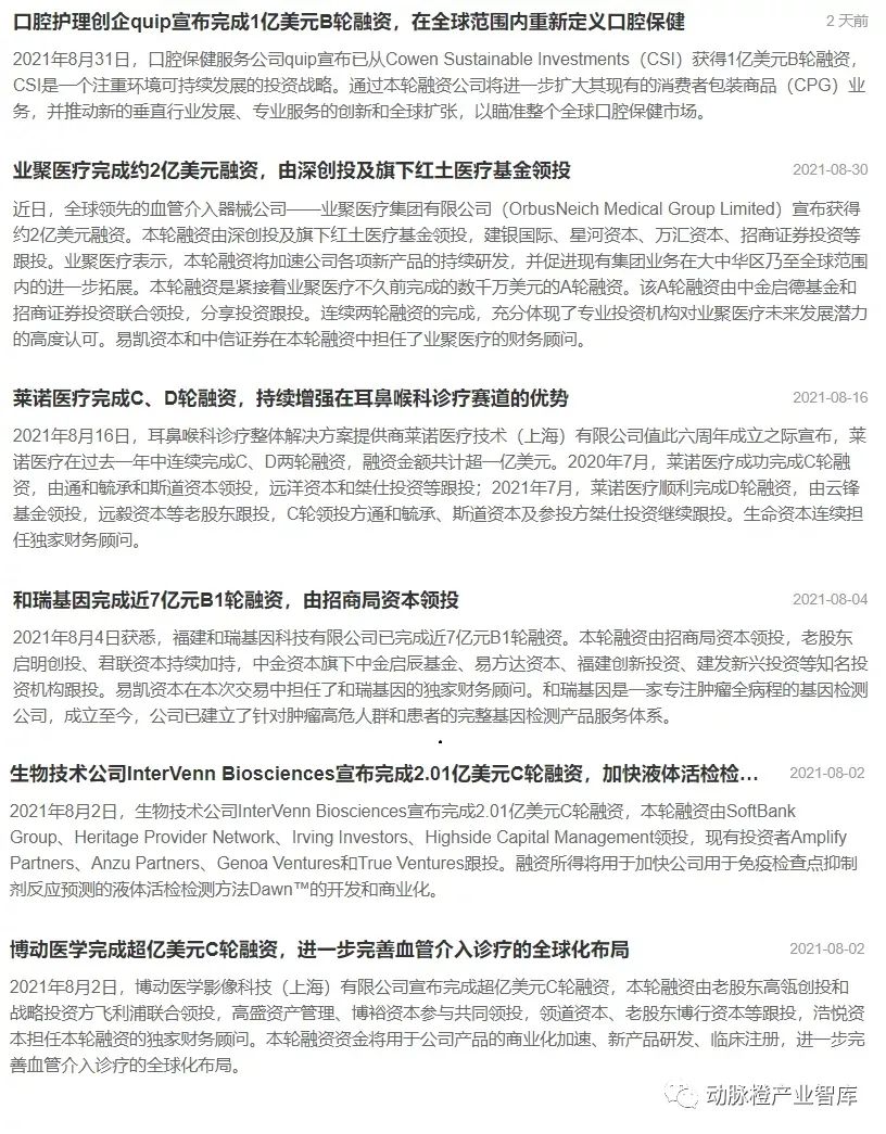 辅助类设备领域融资总额环比上升134%,口腔护理产品提供商quip在8月31日完成1亿美元融资,拉高该领域整体融资总额,通过本轮融资该公司将进一步扩大其现有的消费者包装商品(CPG)业务,并推动新的垂直行业发展、专业服务的创新和全球扩张,以瞄准整个全球口腔保健市场。