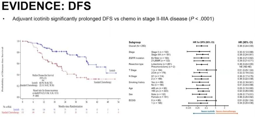 ADAURA和EVIDENCE两项研究都达到了各自预设的DFS主要研究终点。第三代EGFR-TKI与安慰剂组相比,显著延长II-IIIA期患者的中位DFS(未达到 vs 19.6个月,P<0.001),降低了83%的疾病复发或死亡风险(HR=0.17,99% CI=0.11-0.26)1。第一代EGFR-TKI中位DFS达到46.95个月,显著优于对照组(辅助化疗)的22.11个月(HR=0.36,p<0.0001),疾病复发风险降低64%2。