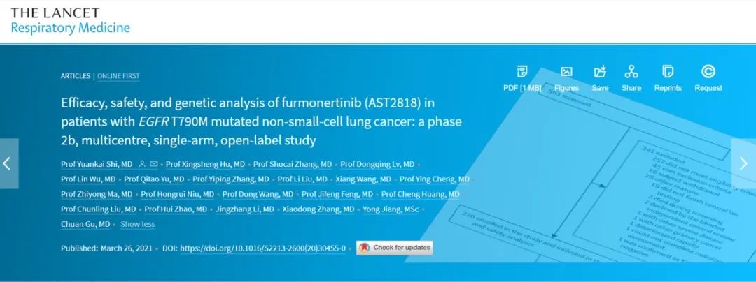 5.Yuankai Shi,Xingsheng Hu,Shucai Zhang, et al. Efficacy, safety, and genetic analysis of furmonertinib (AST2818) in patients with EGFR T790M mutated non-small-cell lung cancer: a phase Ⅱb, multicentre, single-arm, open-label study. Lancet Respir Med. Published on March 26, 2021. DOI: https://doi.org/10.1016/S2213-2600(20)30455-0.