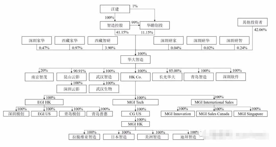 IPO前,汪建旗下智造控股持股41.15%,汪建旗下华瞻创投持股为11.15%;汪建间接持股为52.3%,为公司实际控制人。汪建还是华大基因董事长。