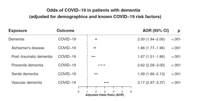 他们发现,与无痴呆症患者相比,痴呆症患者发生COVID-19的风险增加(OR 2.00),其中对血管性痴呆症的影响最大(OR:3.17),其次是老年性痴呆(OR 2.62 )、阿尔茨海默病(OR:1.86 )、老年性痴呆(OR:1.99)和创伤后痴呆(OR:1.67 )。
