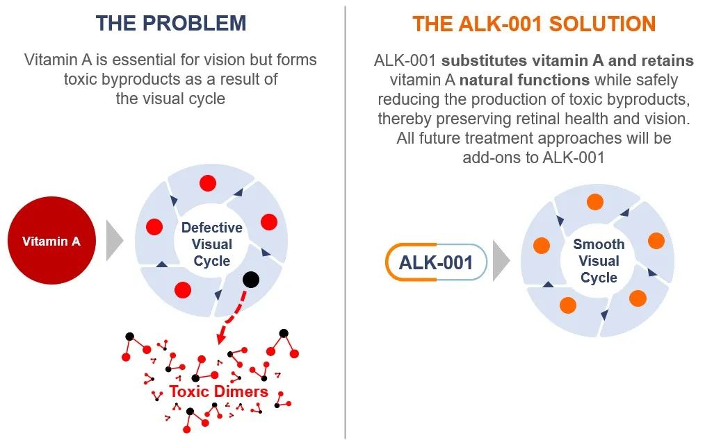 ALK-001是一种维生素A的化学修饰形式,通过替代维生素A并保留其天然功能来减少有毒维生素 A 脂褐素的的产生,每日一次口服给药。临床数据表明,ALK-001可以安全地减缓斯特格氏病的进展,同时保持正常的视觉周期。