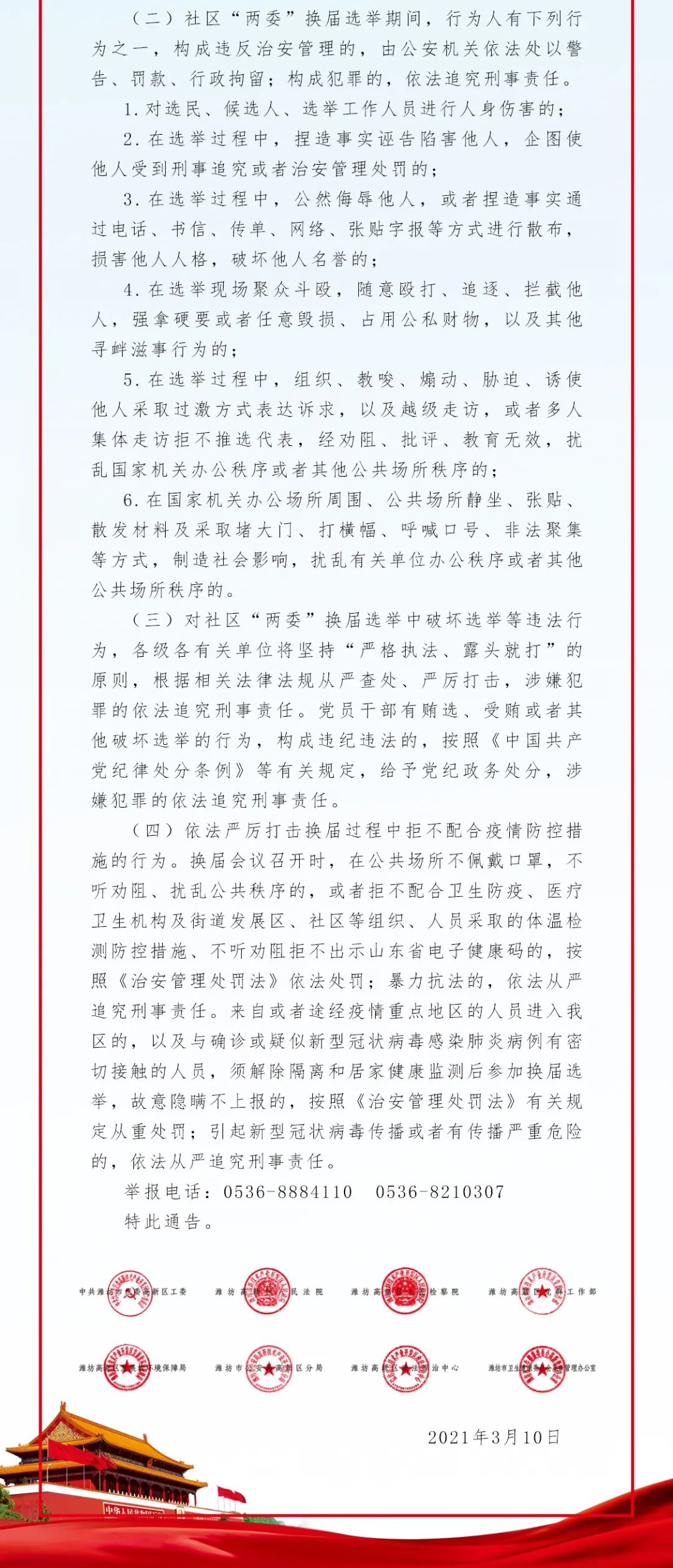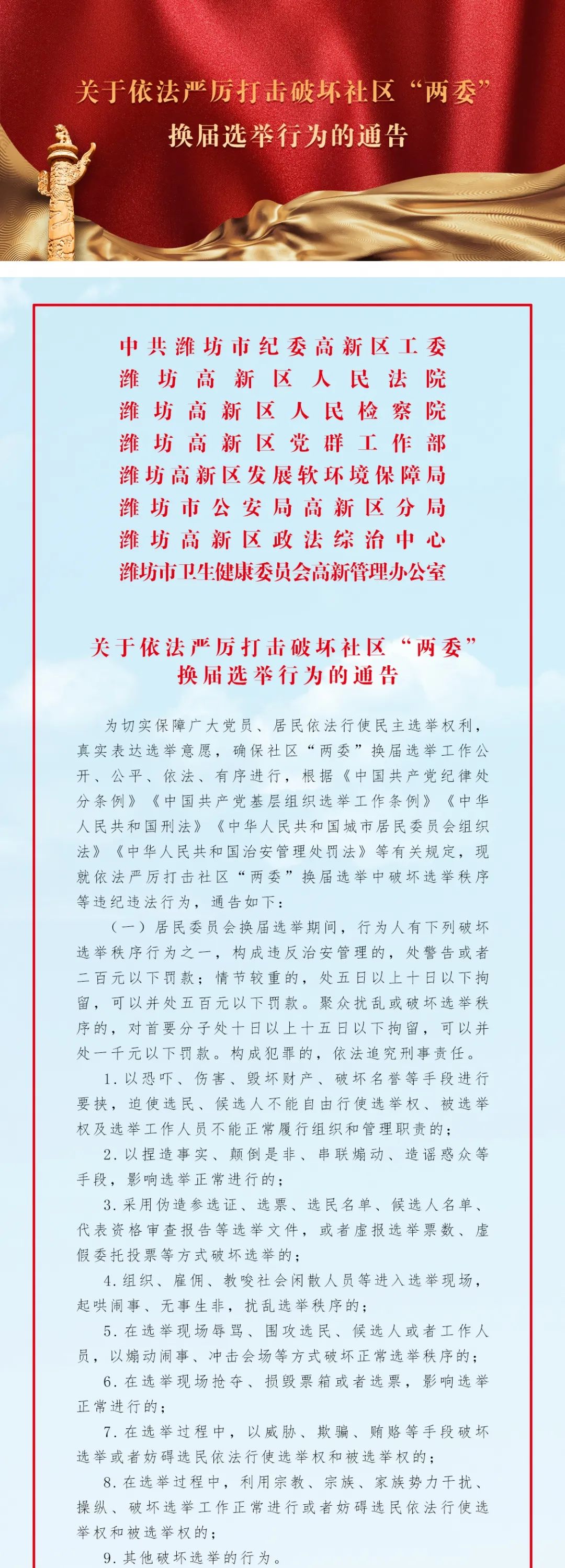关于依法严厉打击破坏社区“两委”换届选举行为的通告