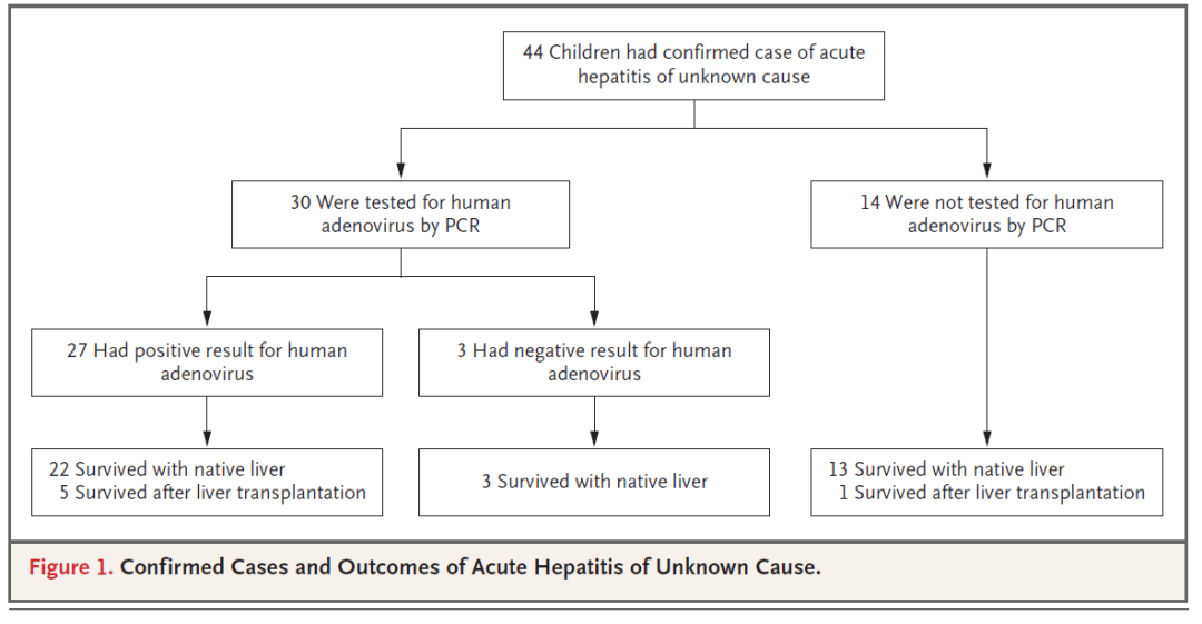 其中一项研究由伯明翰大学的Chayarani Kelgeri博士领衔完成,该研究对44名肝炎患儿展开了回顾性分析,并对其中的30人进行了腺病毒检测。腺病毒检测的样品取材自多个部位,除了外周血外还有粪便和呼吸道分泌物。检测结果显示,27名患儿的腺病毒检测为阳性,随后英国卫生安全局(U.K. Health Security Agency)确定了该病毒分型为腺病毒41型。绝大部分患儿的血液样品呈阳性(93%),呼吸道样品和粪便样品中腺病毒为阳性的人数比例均为67%。此外值得注意的是,病情越严重的受试者体内腺病毒的载量越高,接受肝脏移植的患儿组腺病毒载量中位数(20772 copies/ml)是未接受肝脏移植患儿组的病毒载量中位数(2733 copies/ml)的7倍以上。本研究确定了腺病毒与本轮不明原因肝炎病情有着密切关联,但是未能揭示腺病毒在该疾病的病理进程中所起的具体作用。