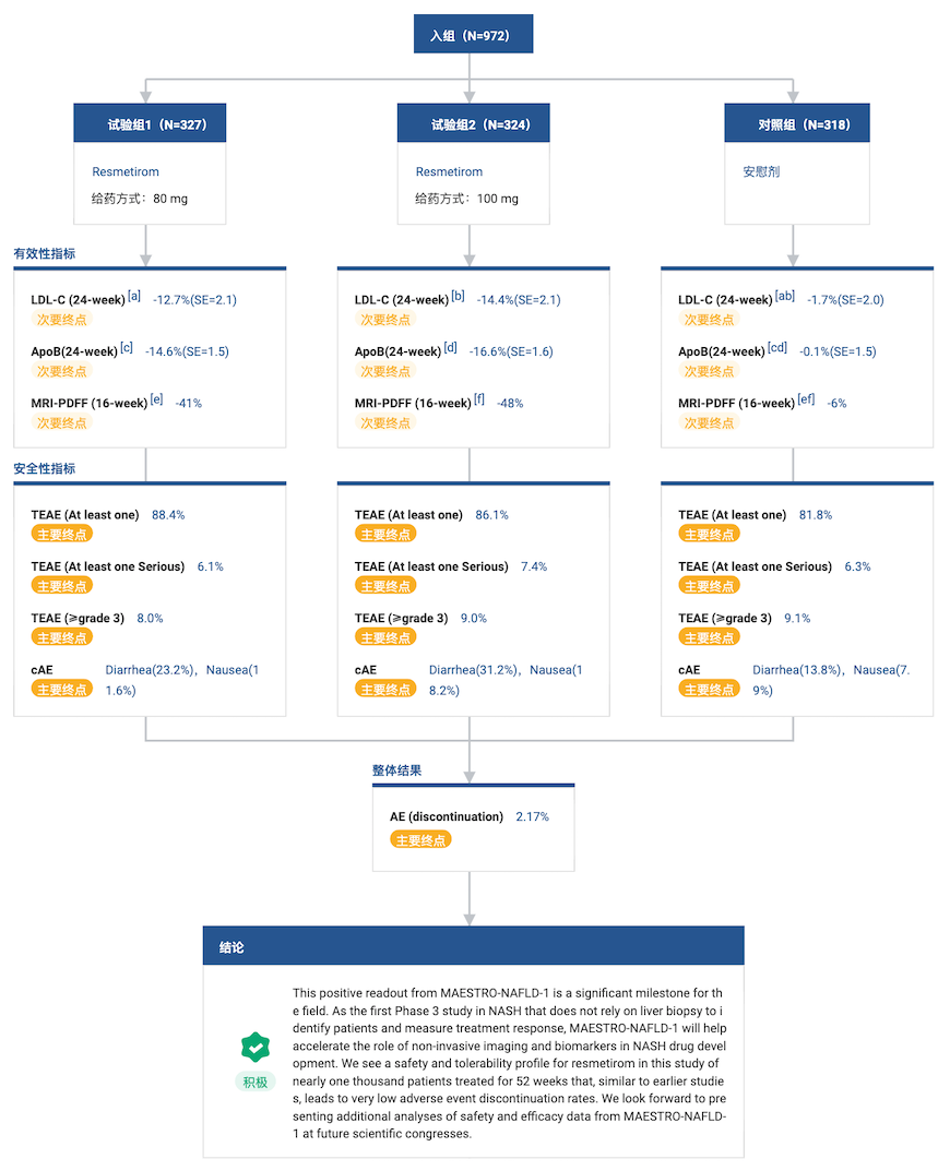 根据 Resmetirom III 期临床试验(登记号:NCT04197479)的 topline 数据显示,近 1000 例患者接受每日 80 mg 或 100 mg resmetirom 治疗 52 周安全性和耐受性良好。有效性方面,相对于安慰剂组,治疗 52 周后 resmetirom 治疗组平均肝脏脂肪含量下降(MRI-PDFF)超过 40%,同时伴随包括 LDLc 在内的血脂水平的显著改善。