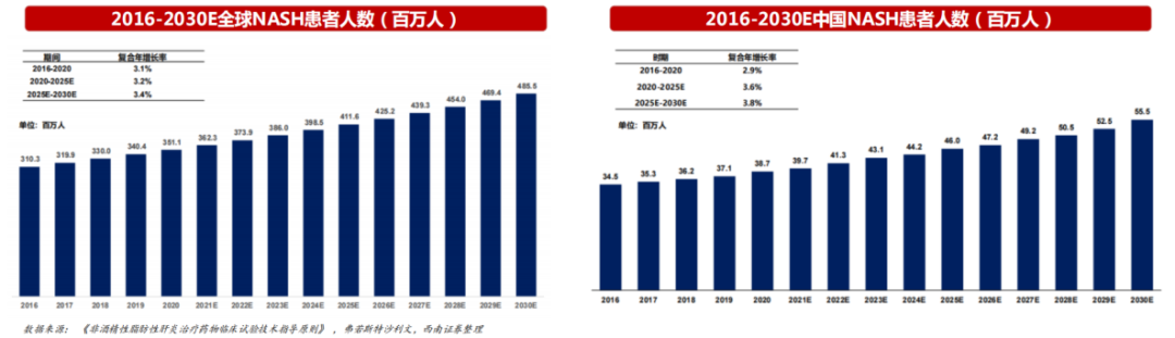 近年来,全球 NASH 患病人数一直呈现上升趋势。根据弗若斯特沙利文数据显示,全球 NASH 患病人数从 2016 年的 3.1 亿人上升到 2020 年的 3.5 亿人,复合年增长率为 3.1%;预计 2025 年将达到 4.1 亿人,2030 年达到 4.8 亿人。