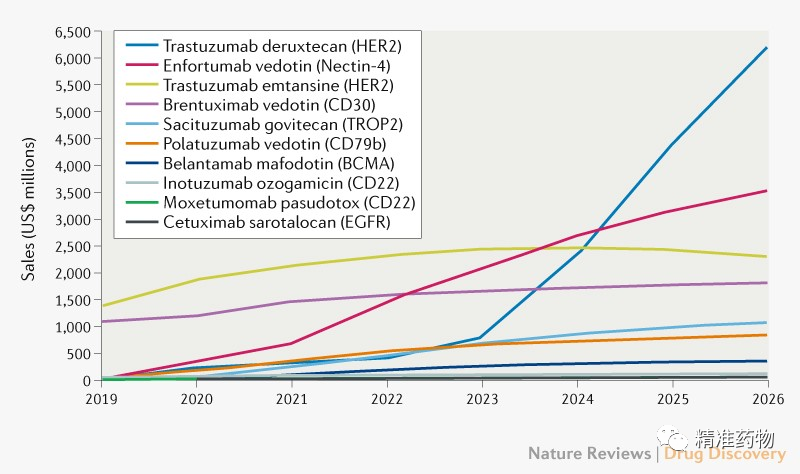 预计2026年,目前已上市ADC的全球销售额将超过164亿美元(图1);其中,trastuzumab deruxtecan由于可用于多种乳腺癌亚群(HER2+、HR+/HER2-和三重阴性)且治疗时间长,将以62亿美元成为销量最高的ADC。而曲妥珠单抗emtansine由于仅限于HER2+乳腺癌和仿制药的竞争,销售额将为23亿美元。