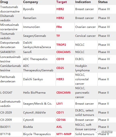 许多其他ADC处于II期开发阶段,新靶点包括LIV1(ladiratuzumab vedotin)、AXL(BA3011)和MT1-MMP等。