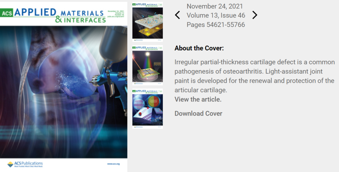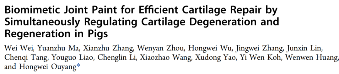 10 月 27 日,相关论文以《仿生关节油漆对猪软骨退变和再生的同时调控》(Biomimetic Joint Paint for Efficient Cartilage Repair bySimultaneously Regulating Cartilage Degeneration and Regeneration in Pigs)为题,发表在 ACS Applied Materials & Interfaces 上,浙江大学医学院附属第四医院的特聘研究员魏威是第一作者,欧阳宏伟担任通讯作者[1]。