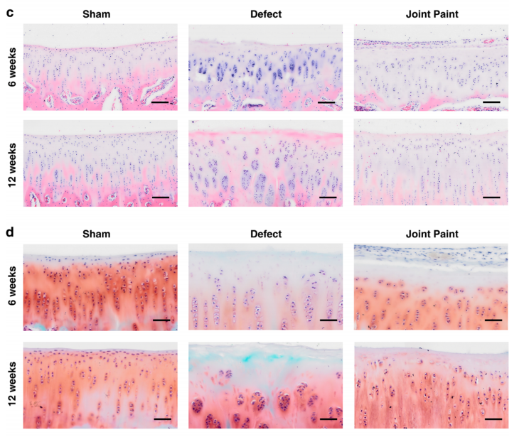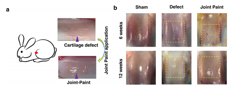 为研究关节漆的修复效果,该团队研究了一种公认的模型动物新西兰白兔,他们把“关节油漆”用于 2mm×6mm 宽、0.2mm 深的缺陷上,并通过光聚合在软骨表面,进行原位固化。