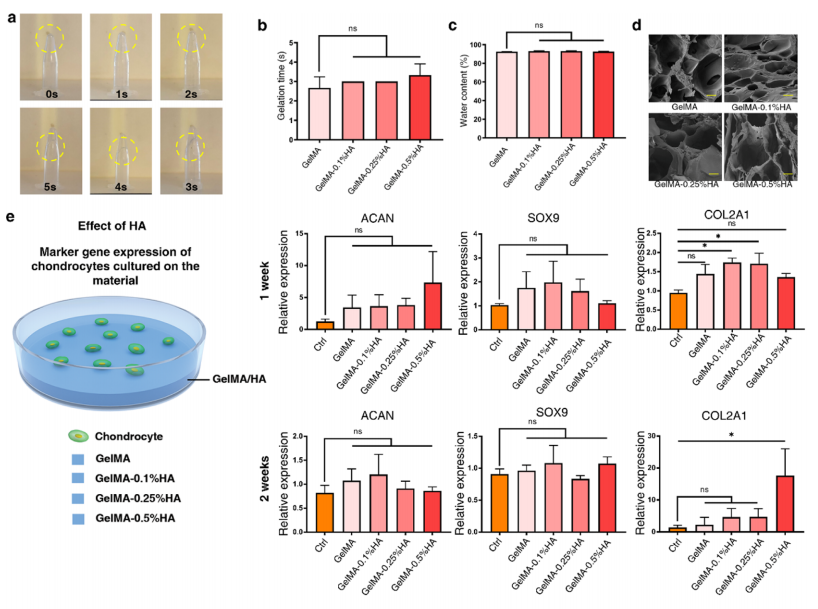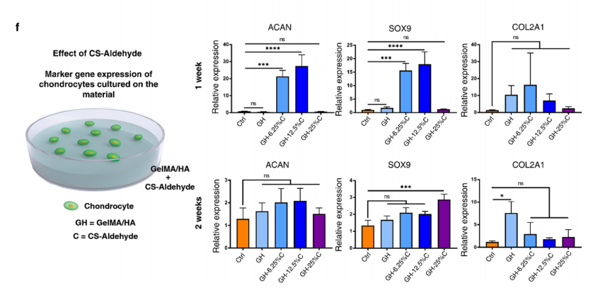 此前研究表明,透明质酸或硫酸软骨素,或有利于软骨细胞的表型维持。因此,他们采用甲基丙烯酰化明胶结合透明质酸和硫酸软骨素,结果发现这真的能促进软骨细胞基因表达,并提供稳定的力学强度。