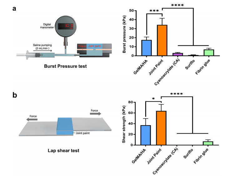 为了定量检测“关节油漆”和组织之间的粘接强度,该团队按照美国材料与试验协会的生物医学粘接剂标准,进行了搭接剪切强度和爆裂压力试验。