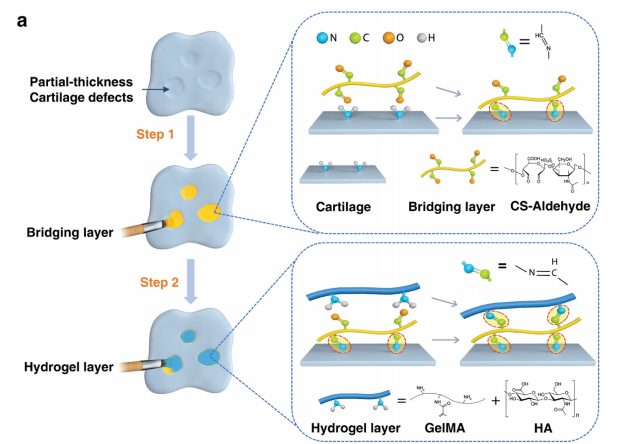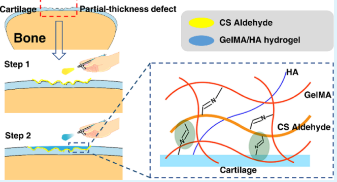 在该团队的设计中,当硫酸软骨素-醛应用于软骨表面时,醛基会和软骨中的氨基发生反应,进而形成亚胺基连接。